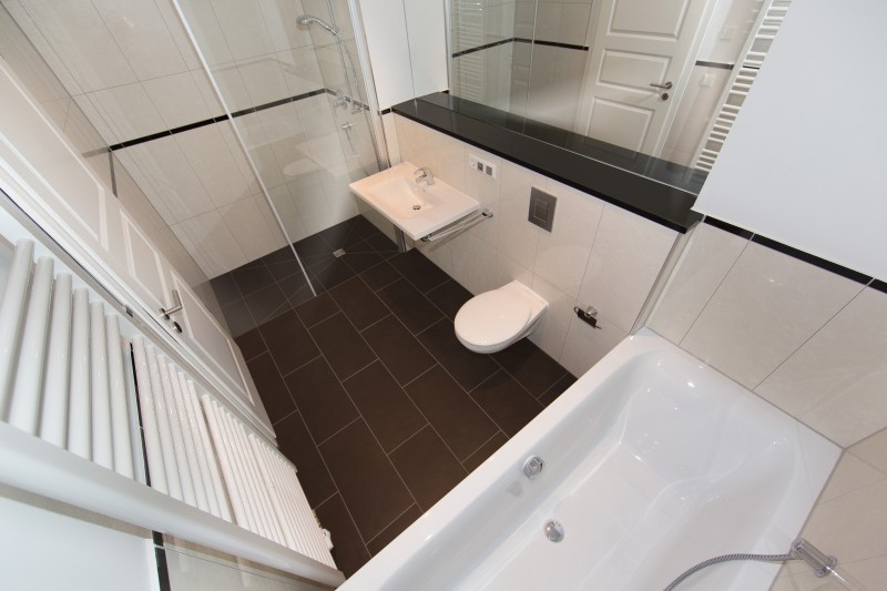 - modernes Bad mit Kristallspiegel, Downlights, Wanne, ebenerdiger Dusche sowie ein