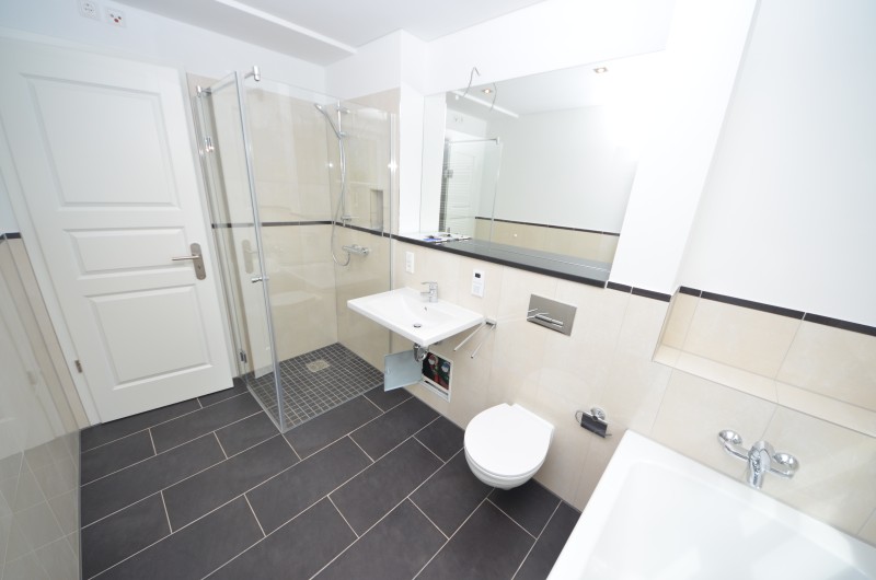 - modernes Bad mit Kristallspiegel, Downlights, Badradio, Badewanne und ebenerdiger Dusche