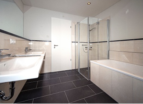 - 2 moderne Bäder mit Kristallspiegel, Downlights, Badradio, Badewanne und/oder ebenerdiger Dusche