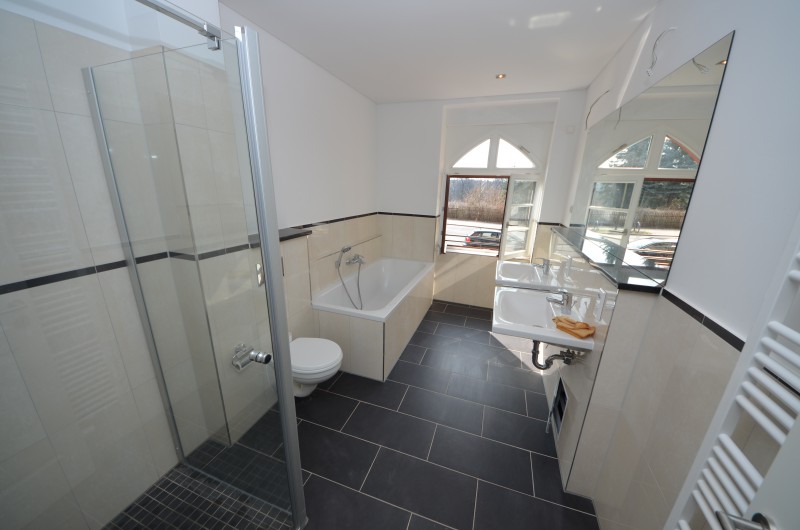 - ein modernes Bad mit Kristallspiegel, Downlights, Badradio, Badewanne und ebenerdiger Dusche