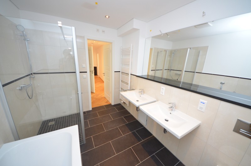 - ein modernes Bad mit Kristallspiegel, Downlights, Badradio, Badewanne und/oder ebenerdiger Dusche