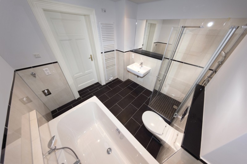 - ein modernes Bad mit Kristallspiegel, Downlights, Badradio, Badewanne und ebenerdiger Dusche