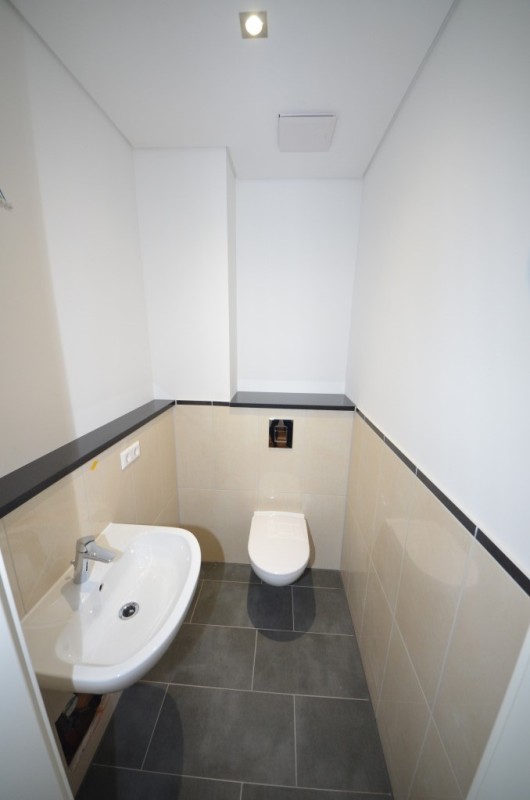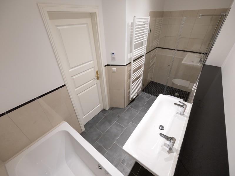 - Bad mit Kristallspiegel, Downlights, Badradio, Badewanne und ebenerdiger Dusche