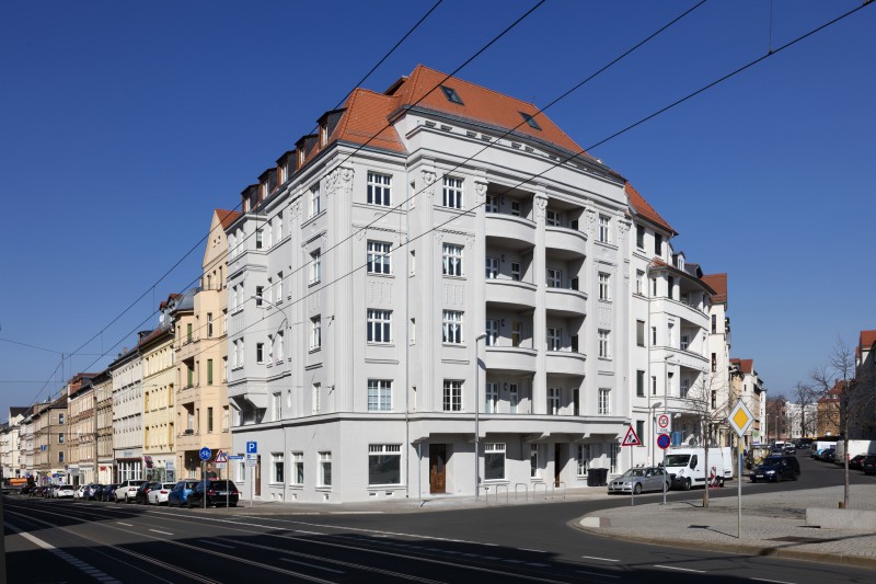 Das imposante Eckgebäude wurde um 1912/13 nach Plänen des Architekten und Bauherren Curt Laux errichtet. Hervorzuheben ist der ehemalige historische Kino-Eingangsbereich und das Treppenhaus mit den stilgerechten Wohnungseingangstüren und den Bleiglasfenstern.