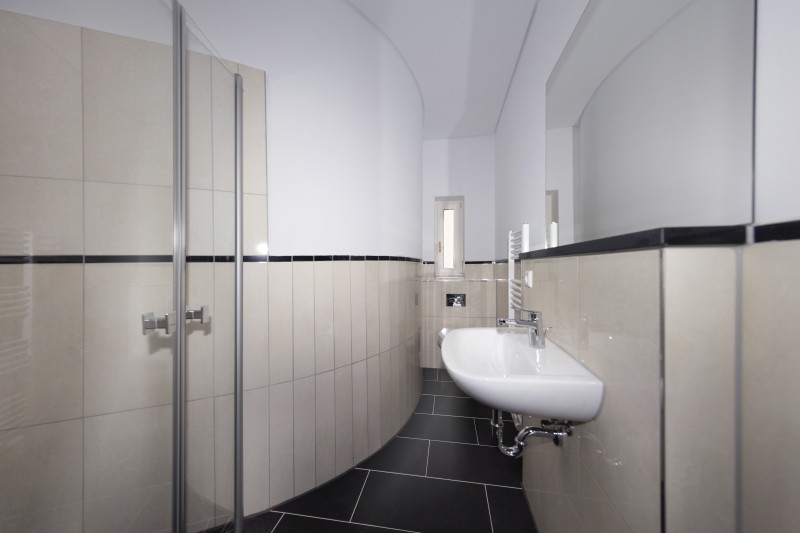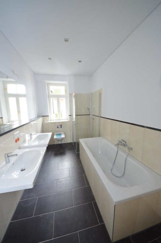 - ein modernes Bad mit Kristallspiegel, Downlights, Badradio, Badewanne und ebenerdiger Dusche