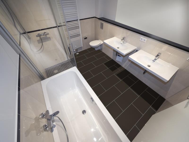 - ein modernes Bad mit Kristallspiegel, Downlights, Wanne, ebenerdiger Dusche sowie ein
