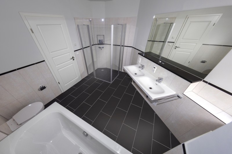 - modernes Tageslichtbad mit Kristallspiegel, Downlights, Badradio, Badewanne