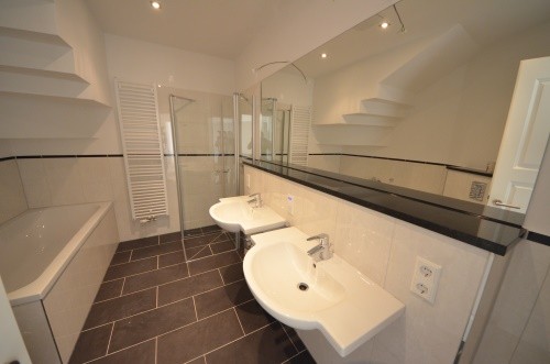 - modernes Bad mit Kristallspiegel, Downlights, Badradio, Dusche, Wanne