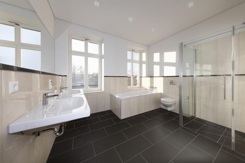 - ein modernes Bad mit Fenster, Kristallspiegel, Downlights, Badradio, Badewanne und ebenerdiger Dusche